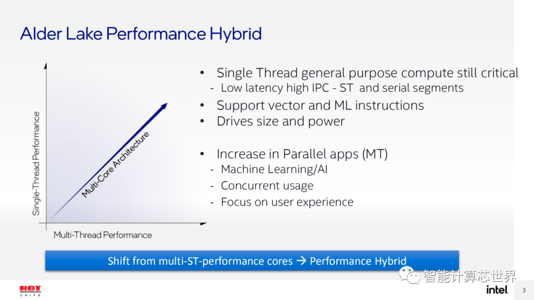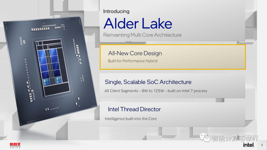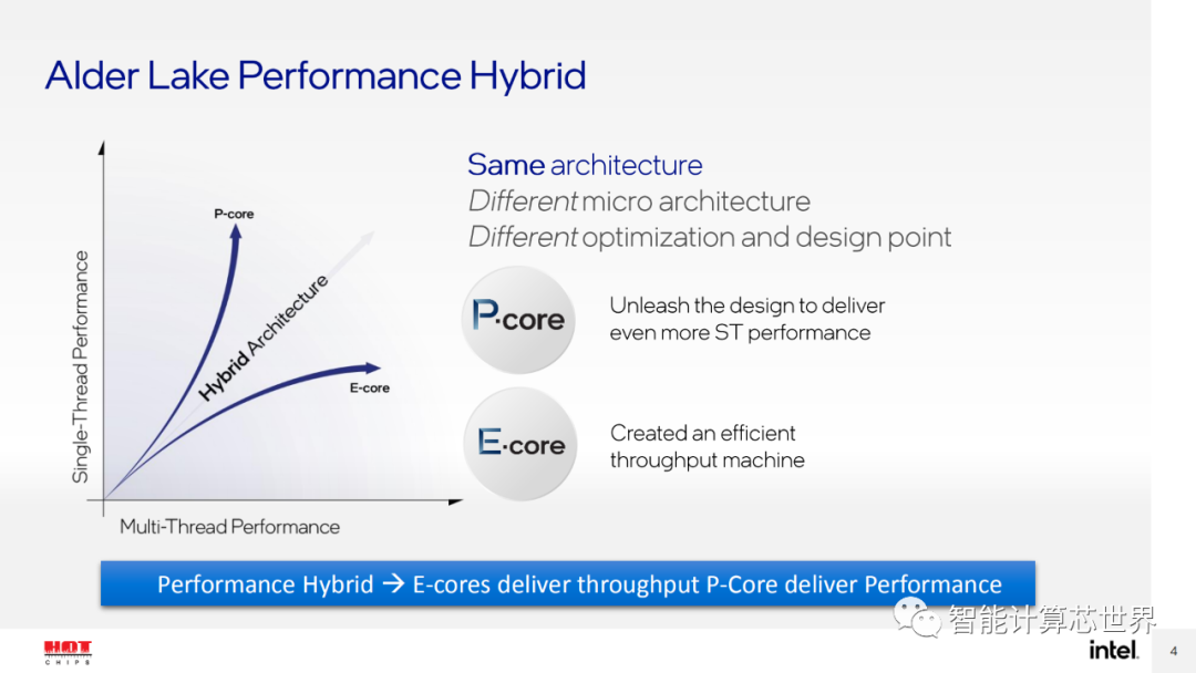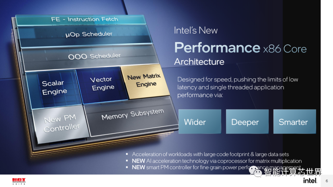 在2021的Hot Chips大会上,英特尔详细解读了高性能处理器——Alder Lake的架构。Alder Lake是英特尔的桌面级CPU架构,英特尔放弃了同构CPU核的设计,转向了大小核。P系列大核专注单线程性能,其中有两个新的东西:一个是Matrix Engine,作为AI协处理器;另外一个是PM Controller,负责细粒度的功耗管理。