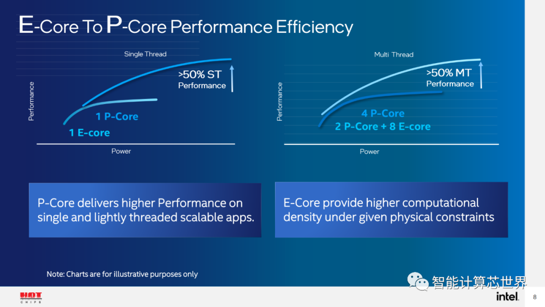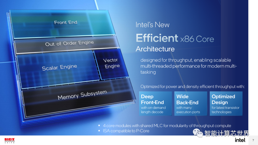 E系列小核专注多线程吞吐(Throughput),所以小核的Front-End更深,Back-End更宽。另外小核和大核的ISA是兼容的,且四核共享MLC。