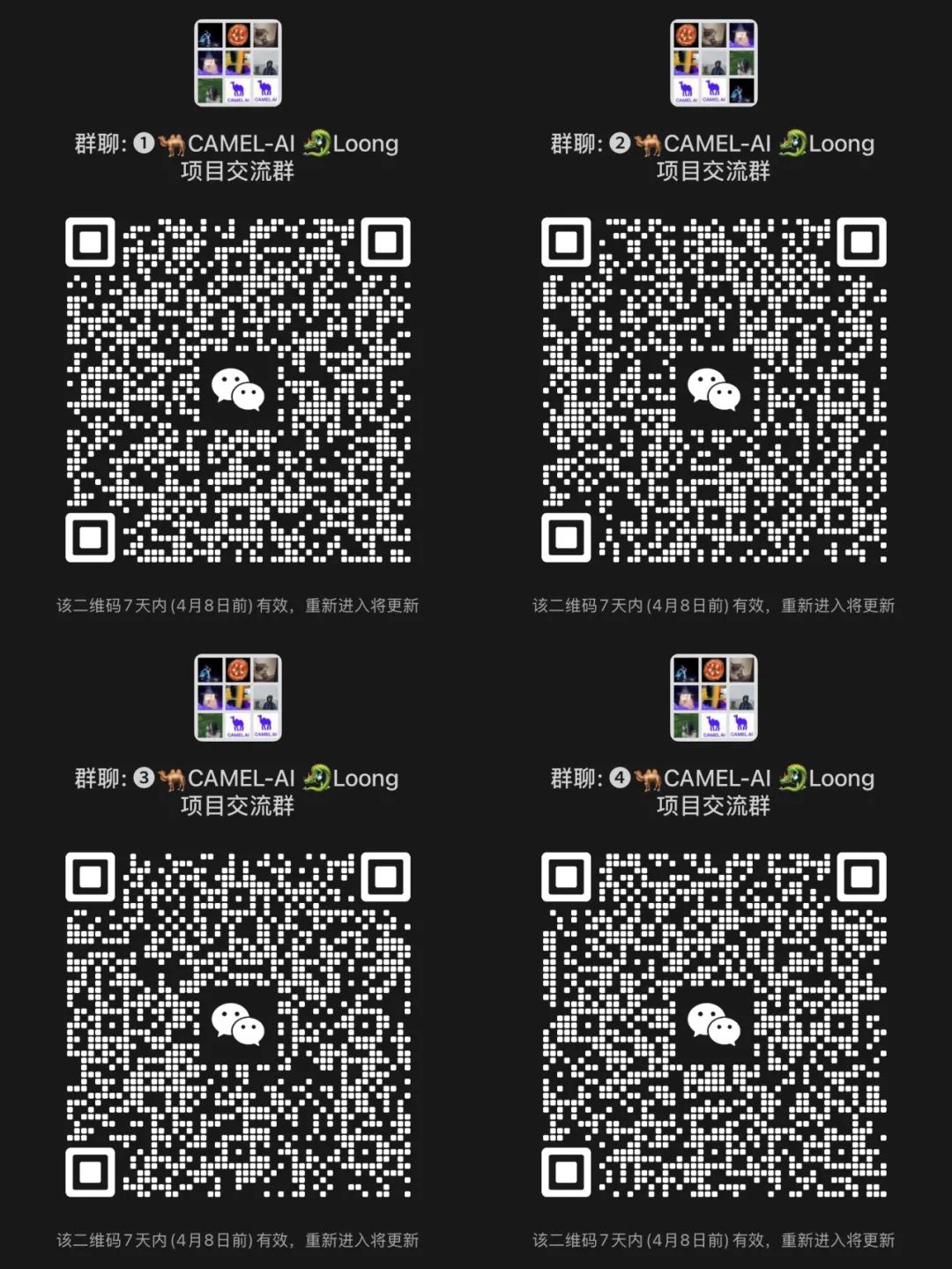 在 CAMEL,我们相信环境(environment)是提升领域推理能力的关键机制。所以除了Loong项目,我们还有其他与环境相关的项目,比如说OASIS、OWL、CRAB。对共建环境(Environments for agents)感兴趣的朋友也可以扫描下方二维码进群交流!