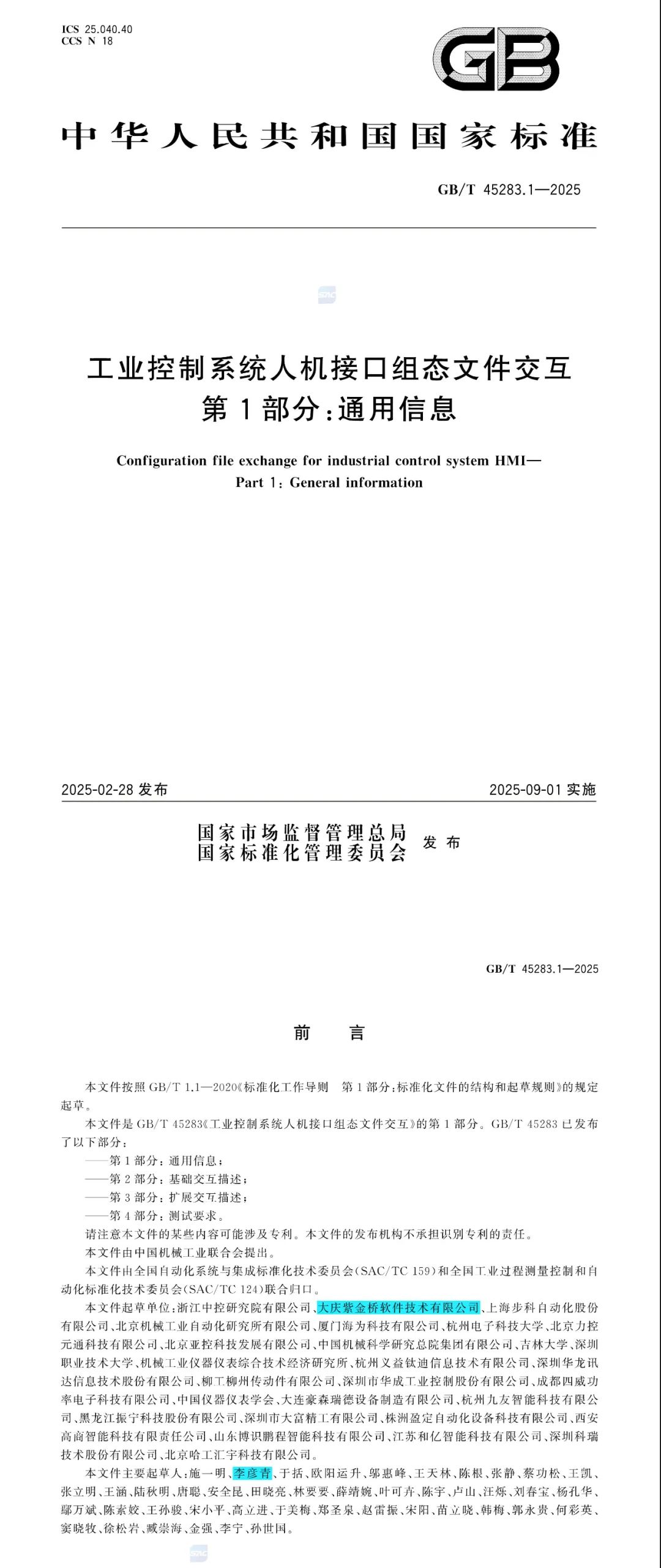 紫金桥软件技术有限公司作为国内工业自动化软件领域的领军企业,历时七年全程深度参与了GB/T45283《工业控制系统人机接口组态文件交互》国家标准的制定工作。