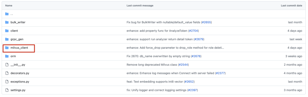 主类,并提供相似的接口方法 (code example changed from PyMilvus ORM to the MilvusClient SDK · milvus-io milvus · Discussion #33979 · GitHub)。