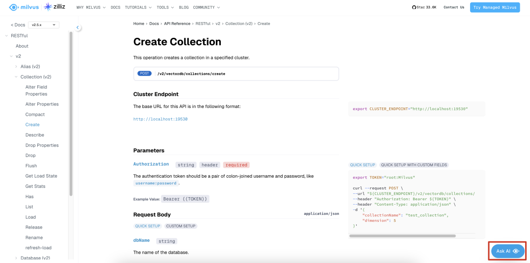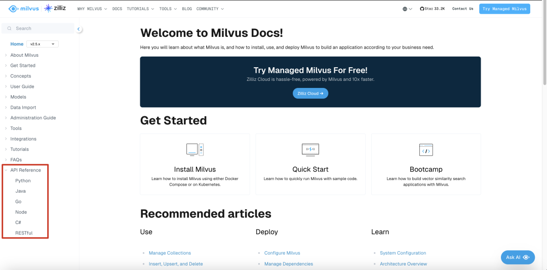 我们全面优化并重构了产品文档,推出了更完整、更清晰的 API Reference,同时在 User Guide 中增加了多语言支持的示例代码,帮助您快速上手、深入理解 Milvus 的各项功能。此外,非常推荐大家使用文档站提供的 Ask AI 助手,它可以帮您介绍新功能、理解 Milvus 内部机理、生成并修改示例代码,使得查阅文档和探索功能变得更加轻松愉快。