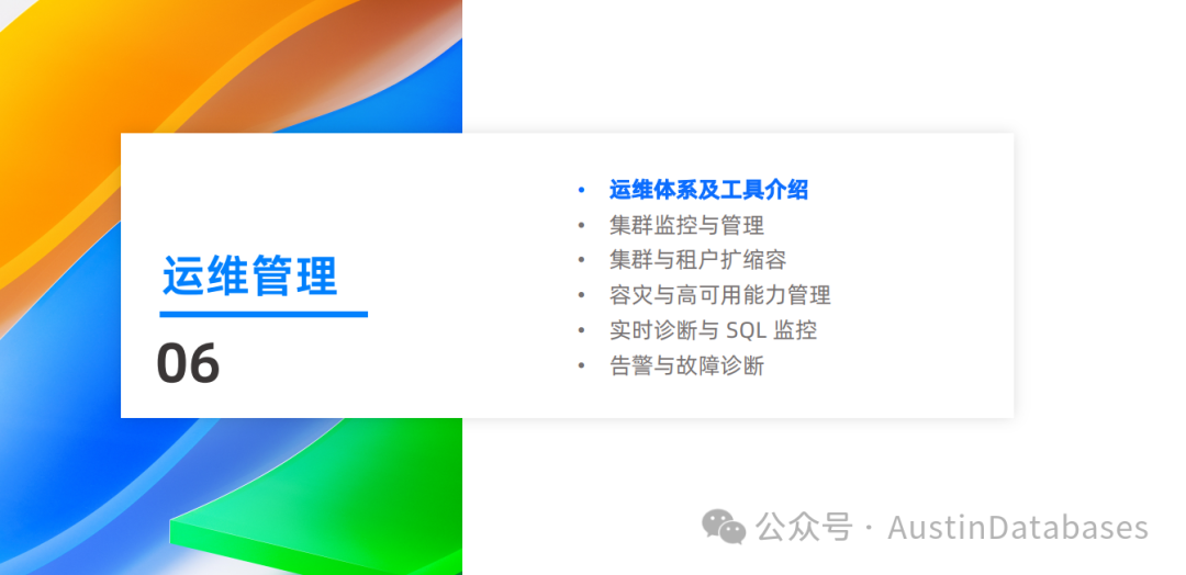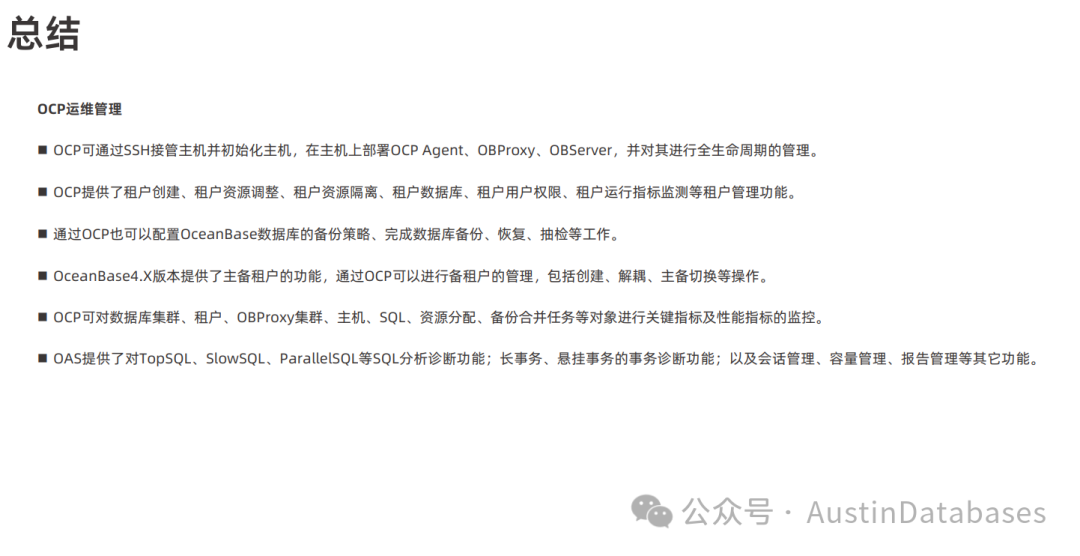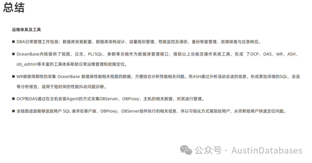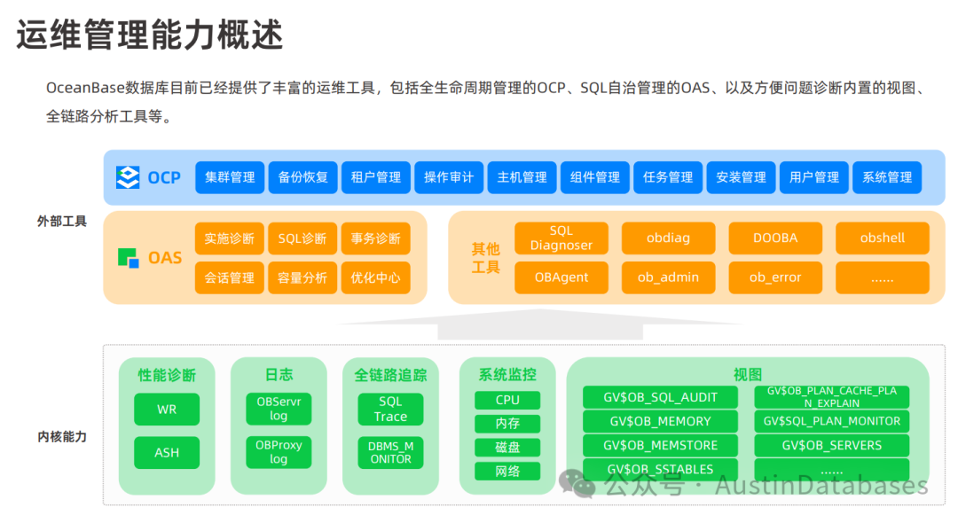 全面的运维管理工具体系:OceanBase 提供了 OCP (OceanBase Cloud Platform) 这样一个全生命周期的综合运维管理平台。OCP 具备全生命周期和可视化的管理能力,可以帮助数据库管理员更加高效轻松地完成日常运维保障工作。此外,还有 WR (Workload Repository) 和 ASH (Active Session History) 等工具用于性能分析和故障诊断.