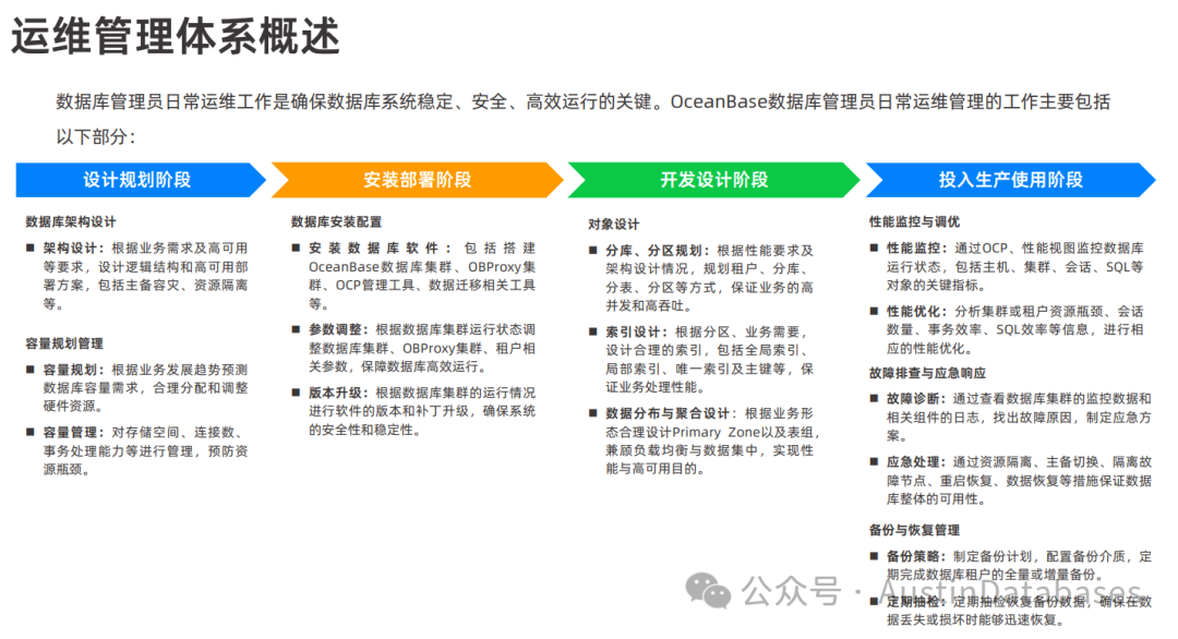 安装部署阶段:DBA需要负责 OB 数据库及相关组件的部署升级,并进行初始化参数设置.