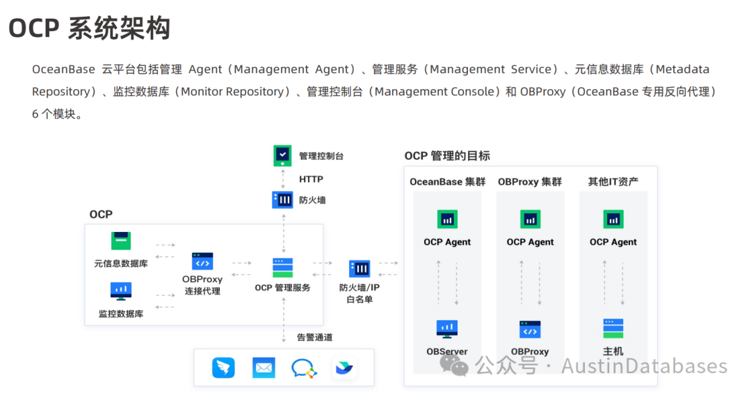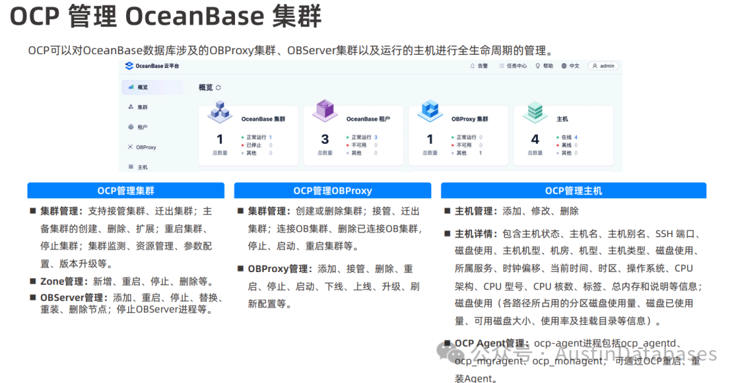 功能描述: OCP 是一个对 OceanBase 全生命周期的综合运维管理平台。它提供了一个 Web 管理控制台,并由管理 Agent、管理服务、元信息数据库、监控数据库以及 OB Proxy 等组件构成。管理 Agent 部署在主机上,负责采集信息和下发指令,从而监控和管理 OB Server、OB Proxy 等组件。OCP 具备全生命周期和可视化的管理能力。