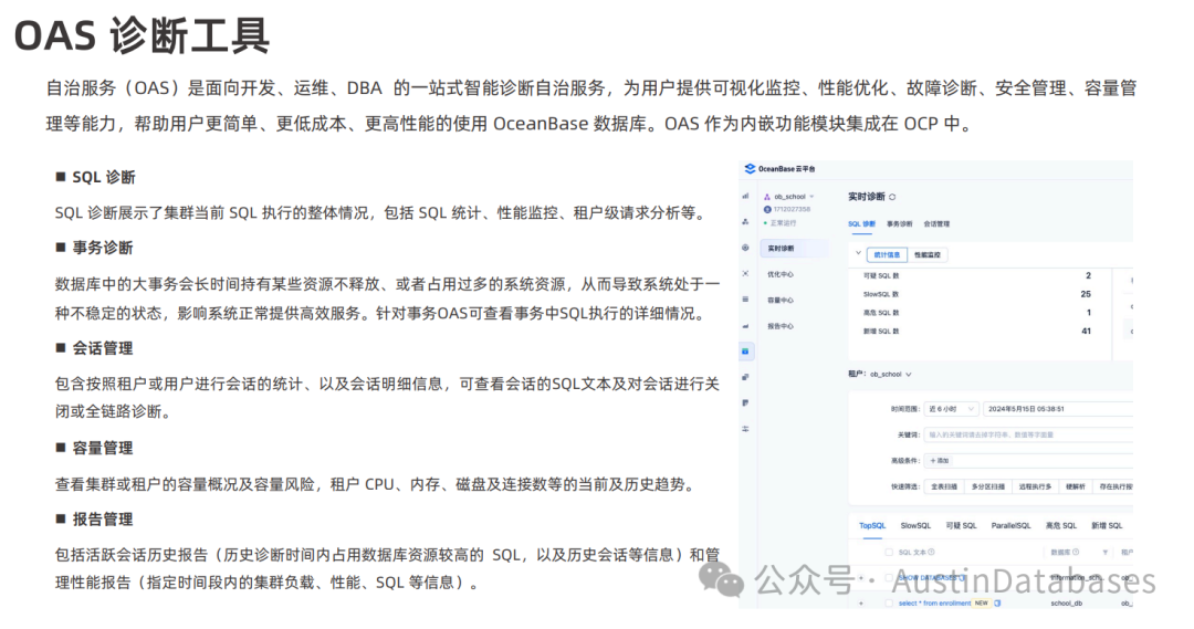 OceanBase 内核提供了丰富的性能视图,可以用于查看数据库的实时运行状态信息。OAS (Ocp Autonomic Service) 专注于智能诊断服务,提供了多种诊断功能,包括 Circle 诊断、事物诊断、规划管理、容量管理、报告管理等.