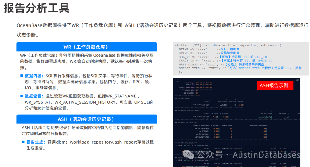功能描述: OceanBase 提供了 WR (工作负载仓库) 和 ASH (活动绘画历史记录) 这两个报告分析工具。