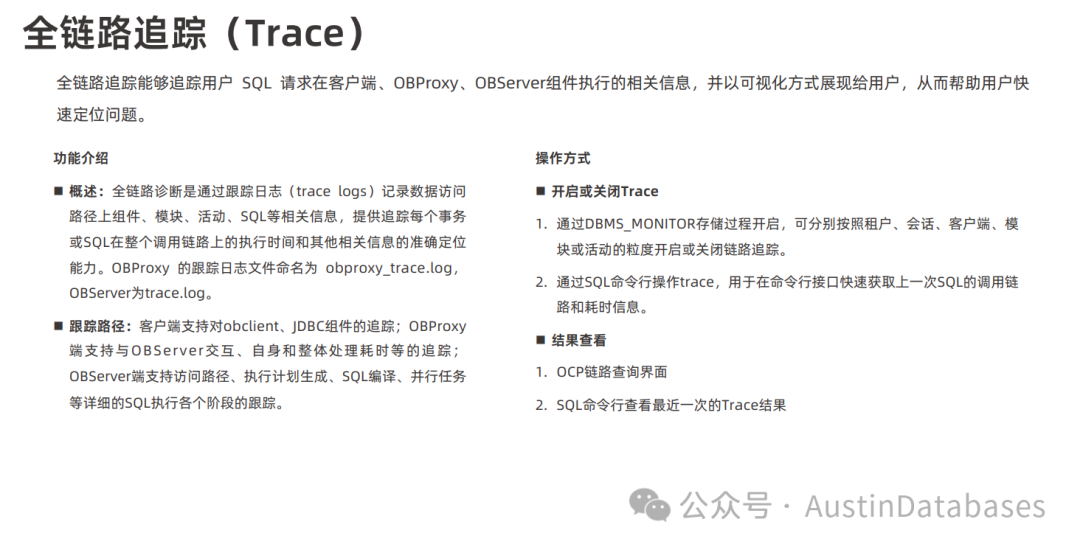 OceanBase 提供了全链路追踪的工具,用于关联分析追踪用户请求在数据库全链路过程中的各个阶段和模块的执行时间,从而提升诊断效率。