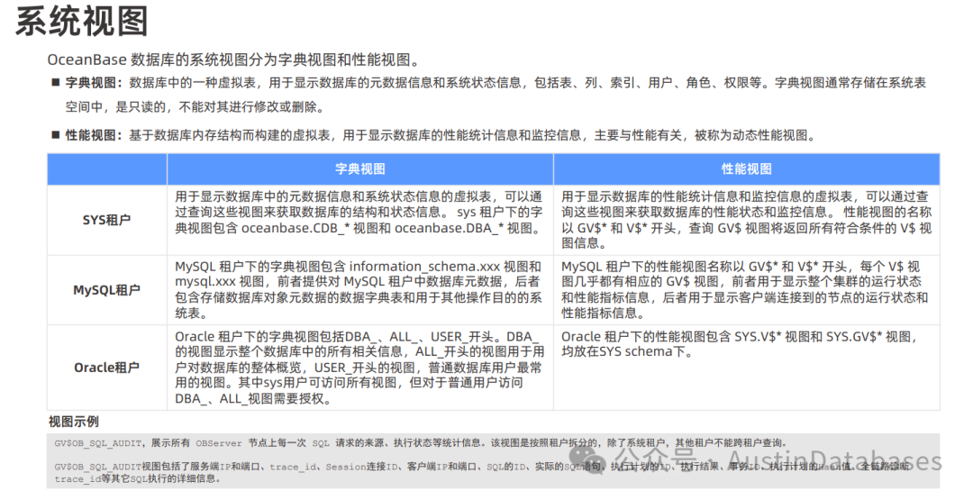 多租户架构下的视图组织:由于 OceanBase 是一个多租户数据库,因此不同租户模式下,视图的组织和前缀有所不同:
