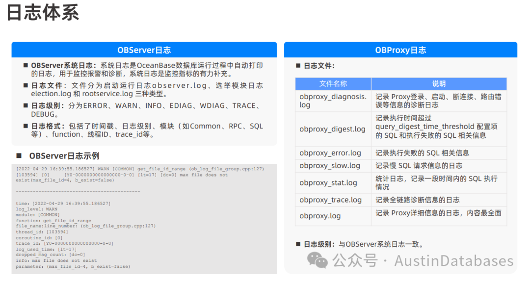 OceanBase 集群中的 OBServer 和 OBProxy 都有完整的日志输出体系,记录了详细的运行信息,是故障诊断的关键部件。OBServer 的系统日志包括启动运行日志、电选画日志等,日志级别分为 7 个级别。OBProxy 日志种类更多,包括 digest 日志、错误日志、慢日志、trace 日志等。