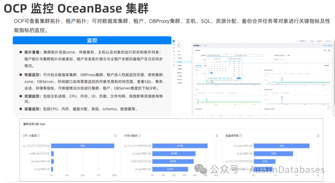 集群管理:OCP 支持对 OceanBase 集群进行创建、删除、扩展等操作。同时可以管理集群内的 Zone,包括新增、重启、停止、删除等。还可以管理 OBServer,包括添加、重启、停止、替换、重装等。OCP 也能管理 OBProxy 集群,支持创建、删除、接管、迁移、连接 OceanBase 集群等操作,以及对 OBProxy 节点的管理。