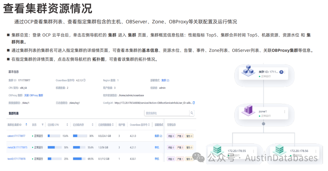 集群的扩容可以通过添加 OBServer 或添加 Zone 的方式在 OCP 上完成. 基于 OCP 的集群资源监控查看OCP 提供了拓扑查看功能,可以查看集群拓扑(包括仲裁服务、主机及对象运行状态等)和租户拓扑,以及租户关系拓扑(主租户和被租户的关系以及日志同步情况).