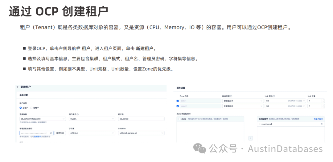 OCP 提供了创建租户的功能。在 OCP 导航栏选择租户链接,进入租户页面,点击新建租户按钮,填写租户类型、对应集群、租户模式、租户名、密码、字符集等信息,并设置 Zone 优先级副本、Unit 规格、安全设置、参数设置等信息后提交即可创建租户.