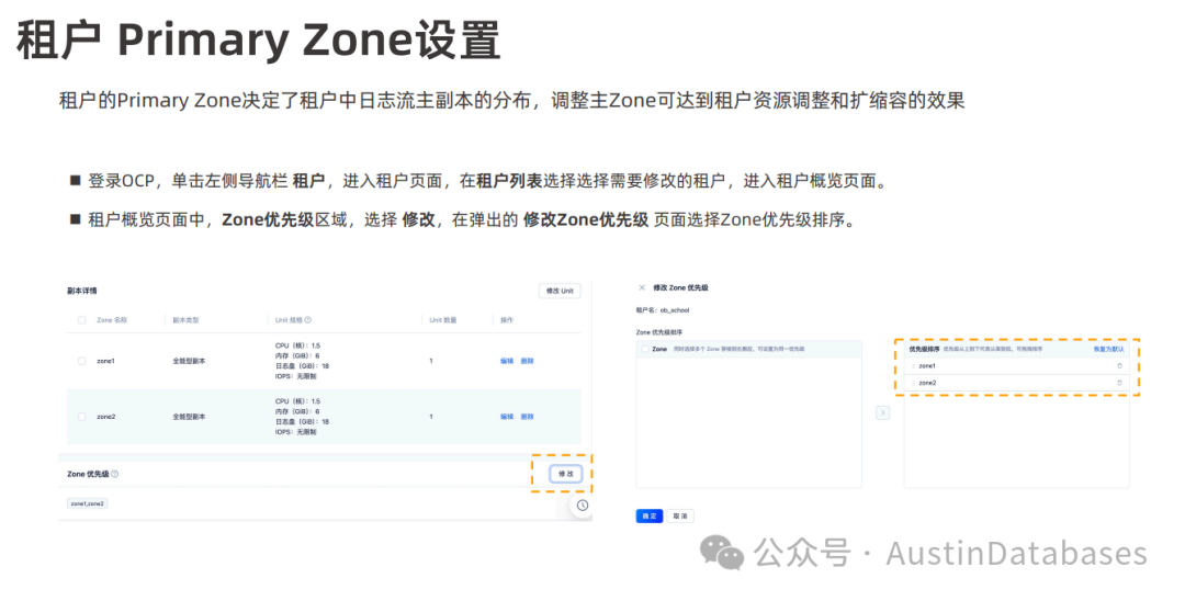 资源隔离: 支持资源组的创建、修改和删除,以及资源隔离计划的创建、修改、删除、启用、停用等操作。可以通过调整租户的 primary zone 来调节主副本的分布,从而调整和扩充租户的资源。