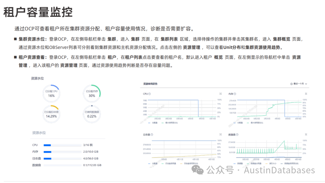 调整 Unit 数量: 在租户的副本详情区域点击修改 Unit 按钮,可以同时调整资源规格和 Unit 数量。 基于 OCP 的租户资源查看,进入租户页面,可以查看租户列表和租户的监控账户相关信息.