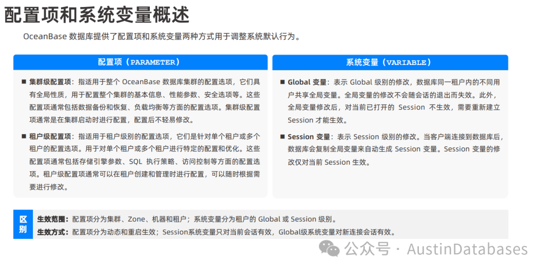 OceanBase 数据库提供了配置项和系统变量两种方式来调整系统的默认行为配置项分为集群集和租户集集群级配置项用于配置整个集群的基本信息、性能参数、安全选项等,通常包括数据备份和恢复、负载均衡等方面的配置选项。