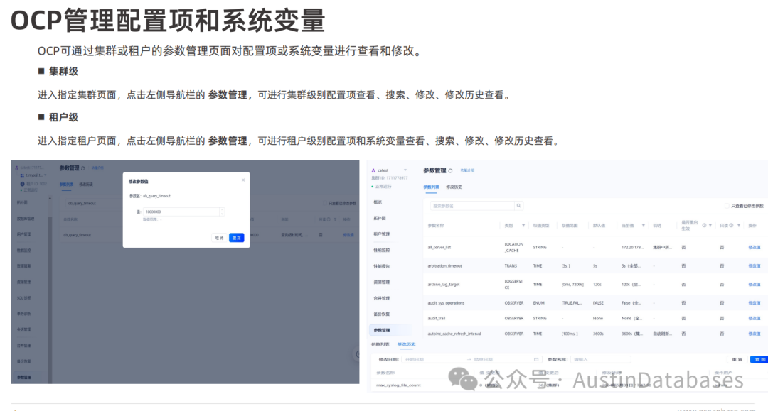 OCP 支持对集群级和租户级的配置项和系统变量进行查看、搜索、修改、修改历史查看等操作。 总而言之,OCP 作为 OceanBase 的运维管理平台,提供了全面的集群和租户管理功能,能够监控各种资源的使用情况,并简化了配置项和系统变量的管理,极大地提升了 DBA 的运维效率。
