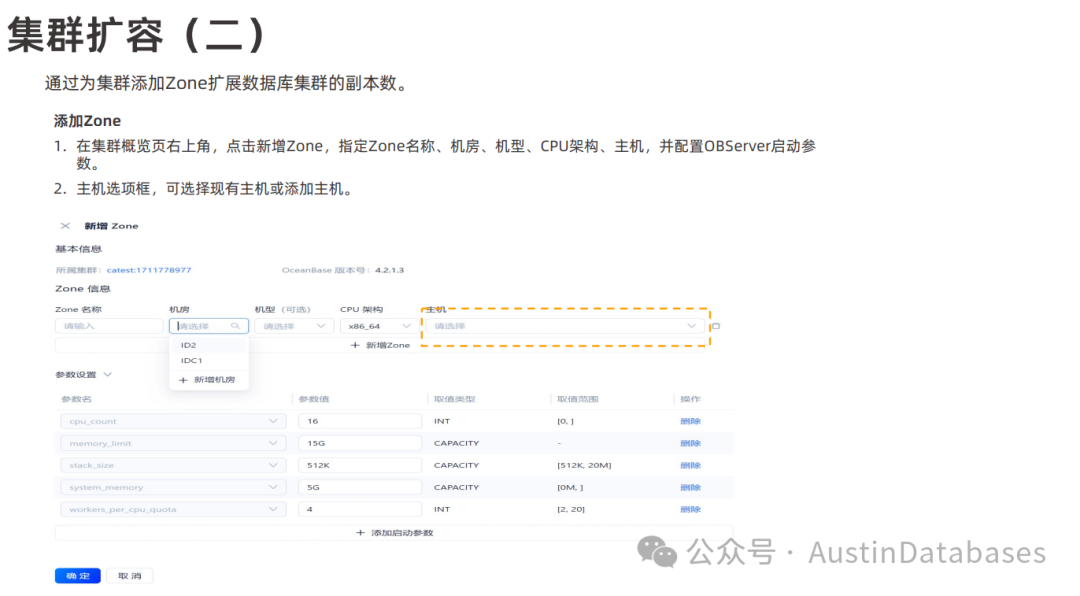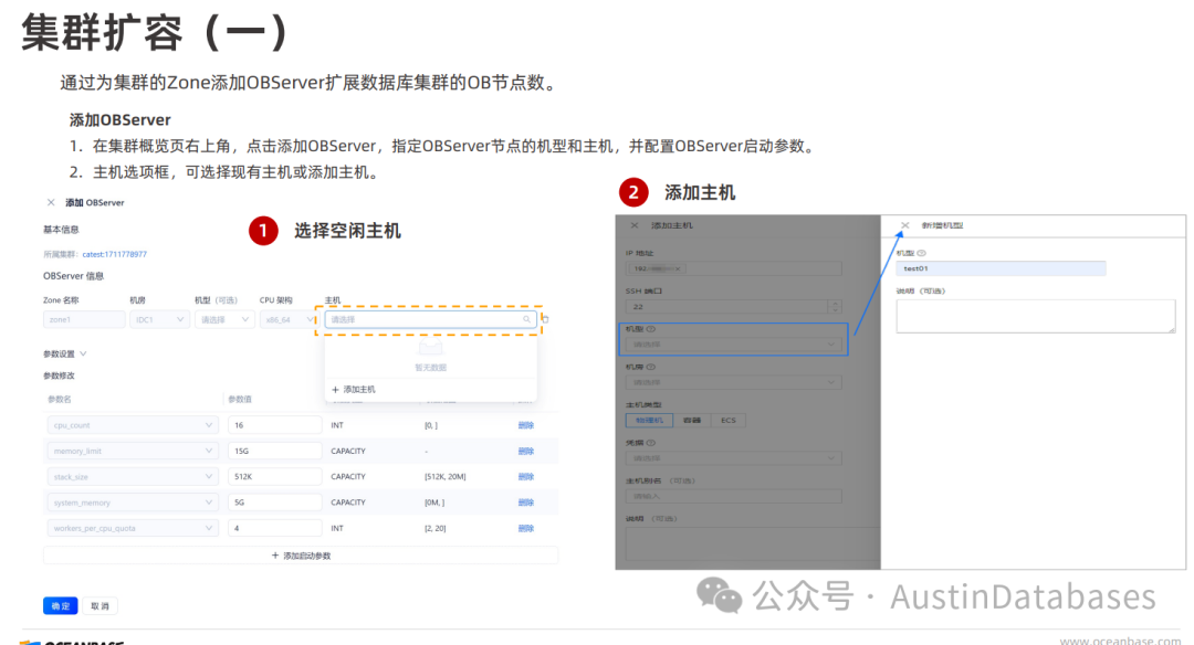添加 OBServer 进行集群扩容在集群概览页面右上角点击“添加 server”。在添加 server 页面,可以选择已有的空闲主机。如果没有空闲的主机,可以在下拉框点击“添加主机”,需要配置新主机的 IP、SSH 端口、机型、机房、用户密码等参数。完成主机选择或添加后,根据需要设置修改参数,点击“确定”按钮,等待任务执行完成即可完成 OBServer 的添加,实现集群扩容。