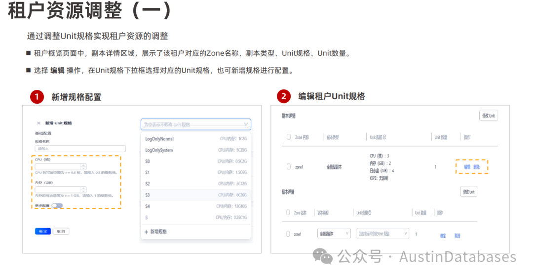 在租户概览页面副本详情区域中,选择要修改 Zone 对应行的“编辑”链接。如果系统默认或已有的 Unit 规格不能满足需求,可以选择“新增 Unit 规格”。新增规格时需要设置规格名称、CPU、内存等信息,选择新的 Unit 规格即可完成调整。