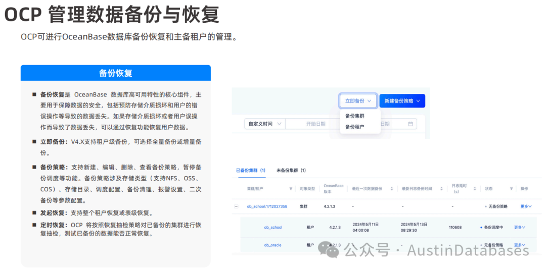 OCP 支持 OceanBase 租户级的备份,可以进行全量或增量备份以进行恢复。在备份策略方面,OCP 支持新建、编辑、删除、查看备份策略、暂停备份、任务调度等操作。备份策略可以配置存储类型、存储目录、调度告警、二次备份等。在发起恢复方面,OCP 支持进行租户级和表级的恢复。OCP 还提供定时恢复功能,按照恢复抽检策略对已备份的集群进行恢复抽检,以测试备份数据的可恢复性。