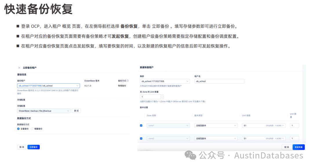 OCP 提供了立即备份的功能,允许用户在不需要提前配置备份策略的情况下发起备份。在需要恢复时,用户需要在租户对应的备份恢复页面点击“发起恢复”,填写恢复时间点并新建恢复租户用于存放恢复的数据。填写完详细信息后,点击“发起恢复”按钮即可开始恢复过程。