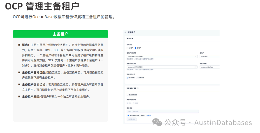 备租户的主要作用之一是提供容灾能力,当主租户发生故障或灾难时,可以通过 OCP 发起容灾切换,将业务快速切换到备租户上,从而保证业务的连续性。容灾切换后,原来的备租户将接管所有的业务,成为新的主租户。 总而言之,OCP 提供了全面的数据备份和恢复管理功能,支持快速恢复操作。同时,OCP 能够有效地管理 OceanBase 的主备租户架构,并利用备租户提供可靠的容灾能力。