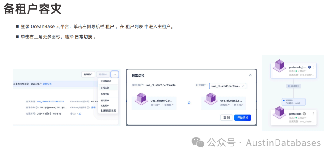 日常切换用于容灾演练,切换完成后主备角色互换。OCP 可以指定租户或集群下所有的主备租户进行日常切换。容灾切换用于真实发生灾难后,由备租户接管主租户的业务。切换完成后,原来的备租户接管所有的业务。