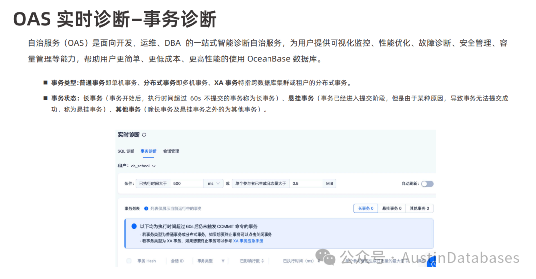 事物诊断功能 可以按照事物类型和事物状态筛选不同租户下占用过多资源或异常的待关注事物,支持查看事务执行、SQL 详情、事物详细信息等信息,也支持关闭事务使其回滚。