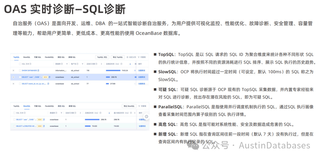 ASH (活动会话历史记录) 用于定位瞬时异常场景,通过查询活动绘画历史视图的数据生成更细粒度的报告。可以通过 ASH report 存储过程生成 ASH 报告,可以指定开始时间和结束时间,以及可选的SQL ID 和 trace ID,以生成更精确的报告. ASH 报告示例包括 top session、top event 以及对应的 SQL 文本信息。 总而言之,OCP 通过内嵌的 OAS 模块提供了全面的 SQL 诊断和调优能力,包括实时的和历史的 SQL 性能分析、多种类型的 SQL 问题诊断、SQL 执行链路的追踪以及基于分析结果的优化建议和操作。同时,结合 WR 和 ASH 等工具,DBA 可以更深入地了解 SQL 的执行情况,并进行更精细化的调优。