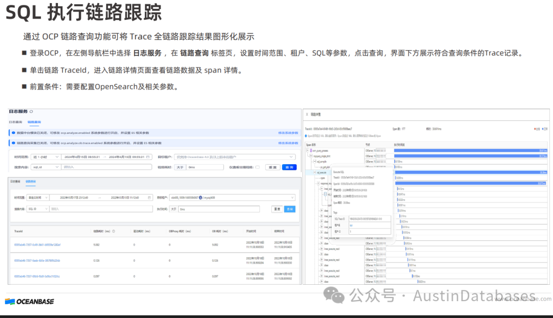 要使用 OCP 的链路查询功能查看 SQL 执行链路,需要配置 OpenSearch 相关参数,因为全链路追踪数据存储在日志中,需要 OpenSearch 组件进行采集和重组. 总而言之,OCP 提供了完善的告警配置、系统性能诊断和日志查询功能,可以帮助 DBA 进行日常运维管理和故障定位。通过配置告警规则及时获取系统异常通知,利用 OAS 和 WR/ASH 等工具进行多维度的性能分析和诊断,以及通过日志查询和全链路追踪定位问题,DBA 可以有效地保障 OceanBase 数据库的稳定运行。