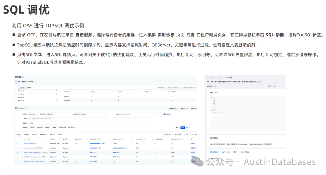 OAS 提供了 SQL 调优 的功能.在SQL诊断的详细信息页面,会给出 优化建议,例如可能包含索引建立的语句。可以根据 执行计划 具体分析如何进行 SQL 优化。对于一些长时间运行、资源消耗大的 SQL,可以进行 限流 操作,当执行计划不佳时,可以手动进行 执行计划绑定 等操作.