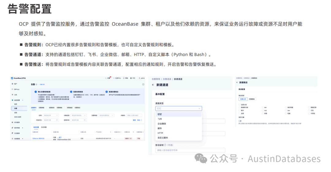 OCP 内置了许多告警规则和告警模板,同时也支持自定义告警规则和模板。OCP 支持多种告警通道,包括钉钉、飞书、邮箱、自定义脚本等。