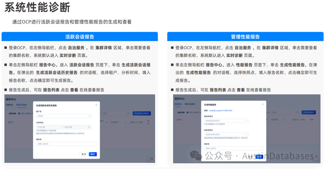 OAS 的报告中心可以生成和查看活跃绘画报告和管理性能报告,用于诊断租户和集群在一定时间范围内的性能问题。WR (工作负载仓库) 定期采集性能相关视图的数据,方便进行历史性能数据分析.ASH (活动会话历史记录) 通过分析活动绘画的信息,形成更详细的 SQL 绘画等分析报告,适用于短时间性能波动问题诊断.