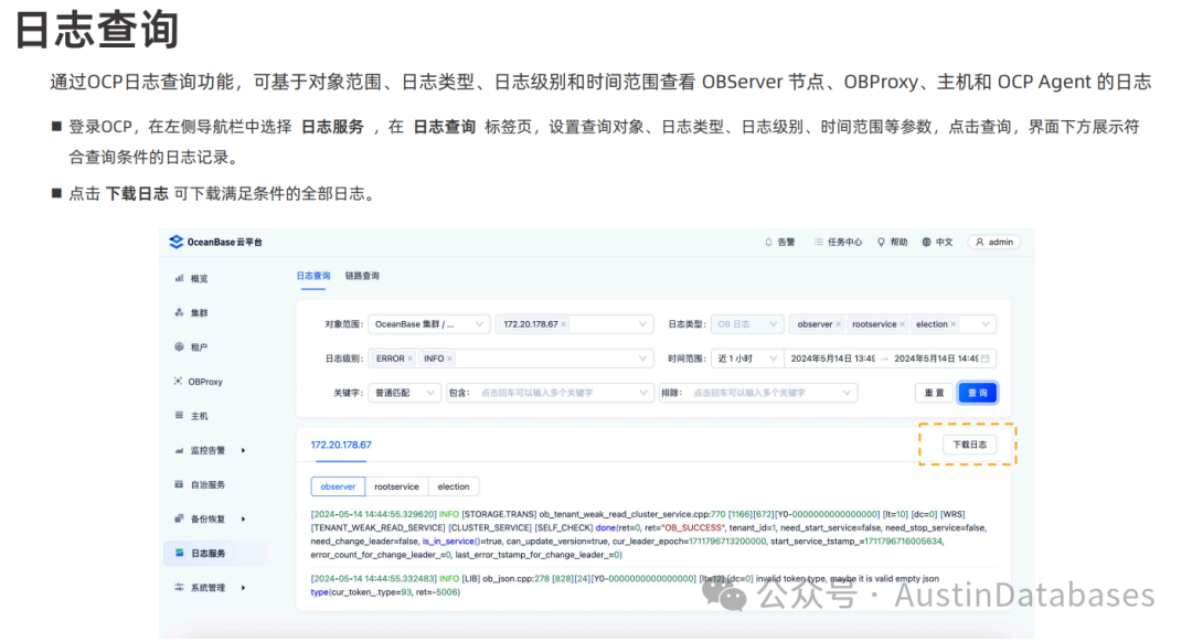 日志查询:OCP 提供了日志服务功能,包含链路查询和日志查询两个模块。在日志查询模块,可以设置涉事对象(如 OceanBase 集群、OBProxy 集群或主机)、日志类型、日志级别、时间范围、关键字等参数进行查询。查询结果会显示满足条件的日志,并支持对日志进行下载。