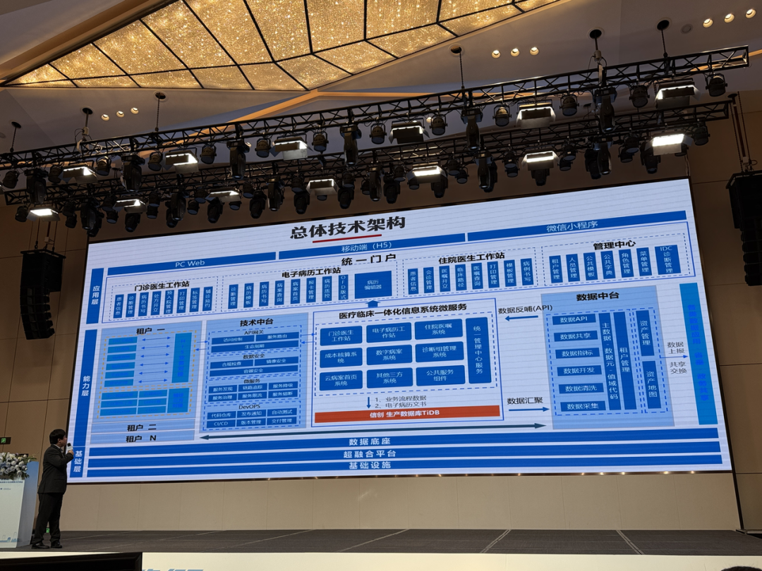 会上,宜昌市中心人民医院信息管理部主任桑野带来了主题为《基于新技术的电子病历应用展示及技术体系》的演讲,分享了 TiDB 在医院数字化系统建设中的关键作用。TiDB 被集成至医疗临床一体化信息系统中,承接基础业务平台和数据中台之间的关键角色,保障数据在各个系统间的流通、处理与共享。