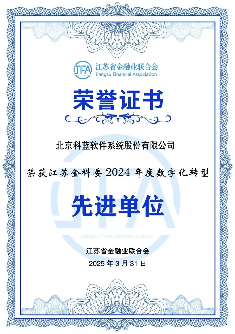 近日,江苏省金融业联合会公布了2024年度数字化转型先进单位名单。科蓝软件凭借其在金融领域助力银行数字化转型的优秀应用实践和强劲实力,继2023年获得该奖项后再次获此殊荣。