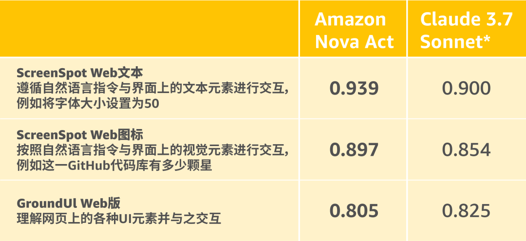 *由亚马逊通用人工智能团队进行了基准测试。在基准测试中,提示词通常保持简单,例如对每个元素使用“点击<元素>”。在测试中,替代提示词并未提高性能,但可能还有进一步的提示词优化空间。结果是由亚马逊内部用于评估目的而测量的,使用(i)Bedrock API对Claude 3.7 Sonnet进行测试。
