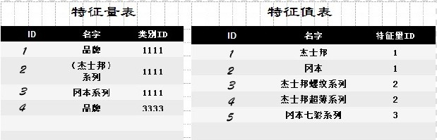 黄色,绿色等等具体的值,特征量表是一个父子关系,比如有的品牌下面有系列,系列下面可能还有系列,右表的数据存在冗余是不可避免的,比如衣服有24个颜色,鞋有24个颜色,虽然特征值是一样,但是是属于不同的特征量的。