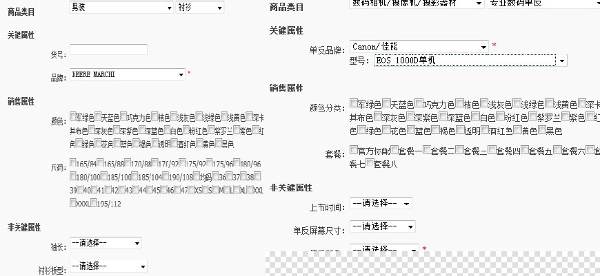 我在实际项目中添加商品的做法是,序列化属性成json字符串到页面,根据特征量中的是否是枚举,是否是父属性,是否关键属性,是否销售属性来动态创建页面表单,效果如他的API页面,如果你有兴趣,可以参考他的JS