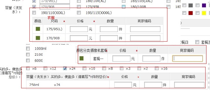 我们看在淘宝中添加衣服和数码相机的情况,这里会出现选择"关键属性" 颜色+尺码之后,出现需要对不同颜色尺码的组合填写价格和数量和商家外部码,相机则是颜色+套餐+外部码,而到了洗发水就是容量+多买多便宜+外部码,这里就是上面介绍的SKU,如果你还不了解SKU,可以做下了解,这样子做的直接好处就是,不同的搭配可能有不同的价格,做库存和销量的统计的时候就能做到准确统计,通过商家的外部编码能让商家关联本地系统,也是为了做统计和库存的方便。