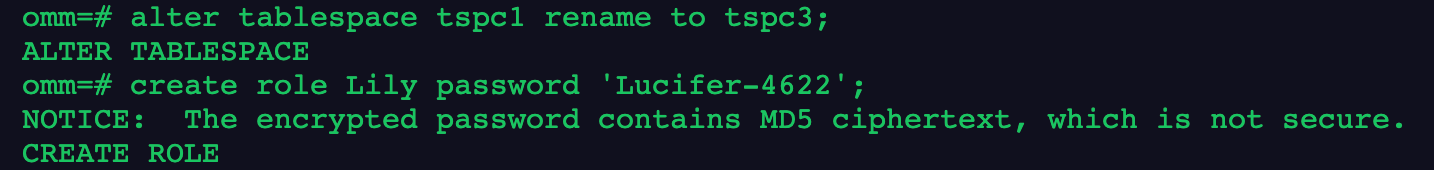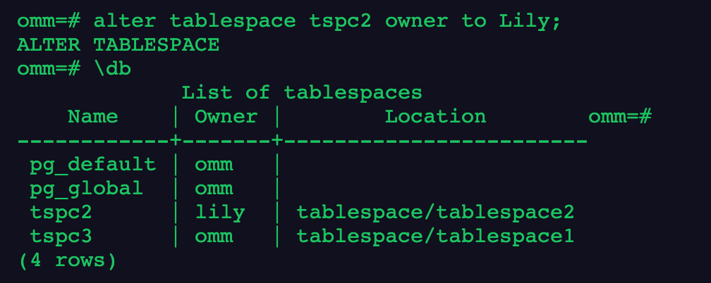 3.重命名tspc1,修改tspc2的用户为Lily,使用\db查看表空间信息