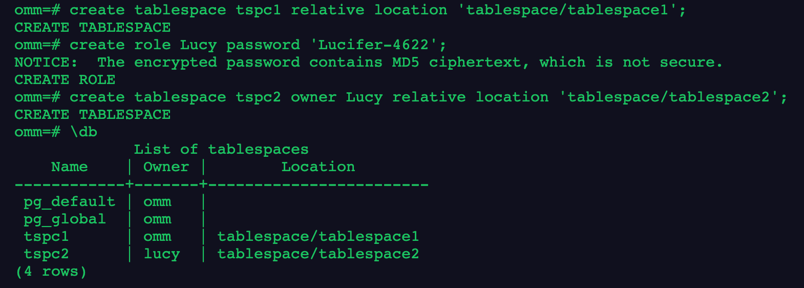 1.创建表空间,表空间tspc1使用相对路径指定所在目录,表空间tspc2指定owner为Lucy