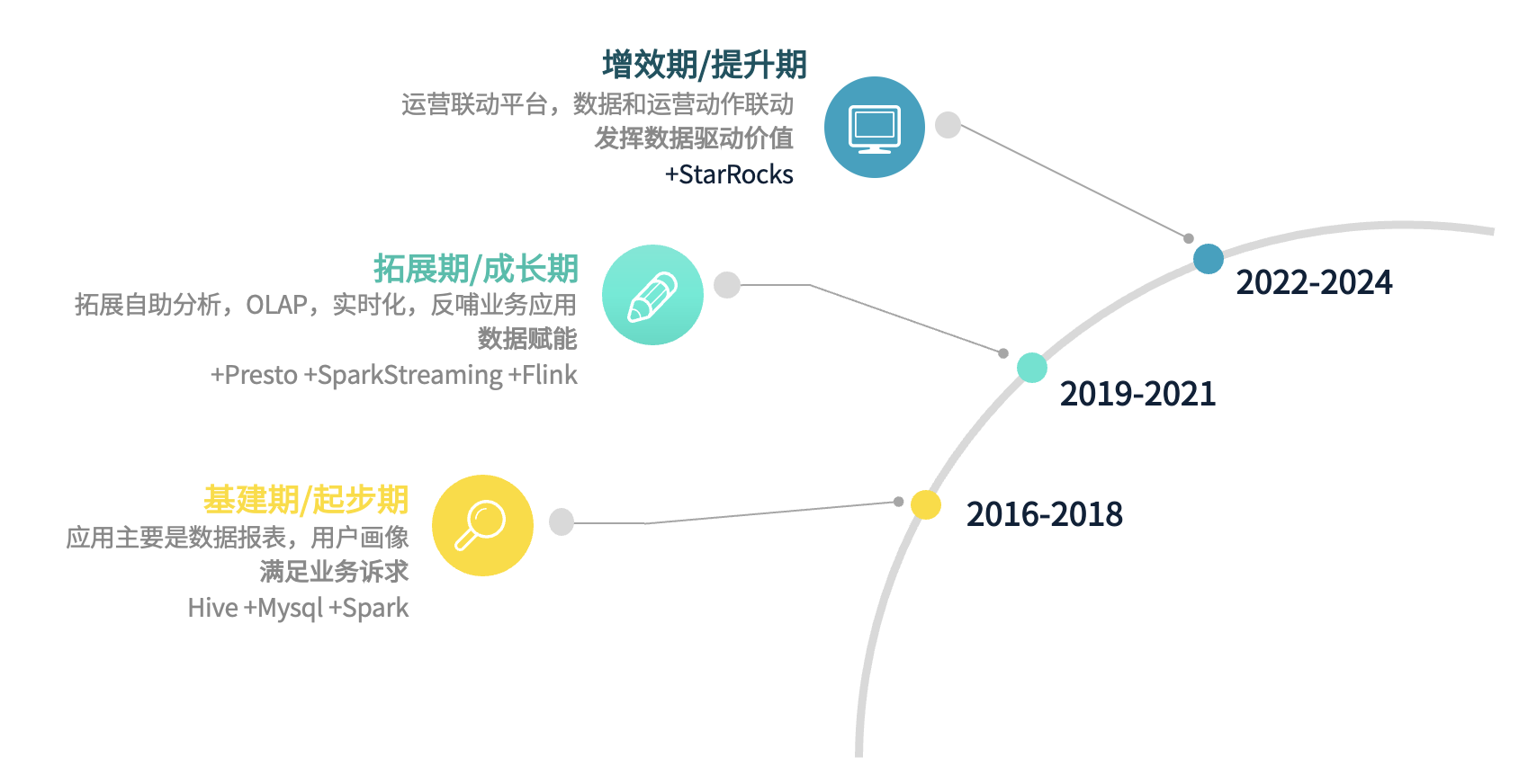 我们的数据架构经历了多个重要发展阶段,与大多数公司类似。最初,我们专注于满足业务报表的数据需求,处于数据基础建设期。随后,我们引入更多组件,进入快速发展期,数据开始反哺业务,发挥赋能作用。