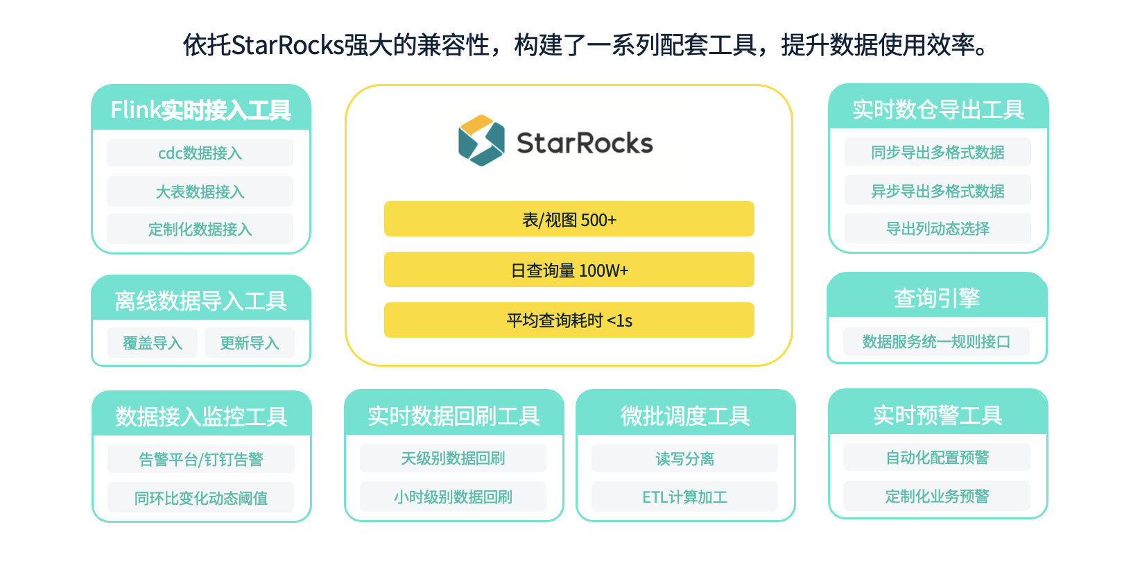 除了数据建设本身,我们还借助 StarRocks 强大的兼容性,建立了一系列配套工具。例如,在数据接入方面,我们基于 Flink 构建了分场景的数据接入工具,支持离线数据导入工具,并且具备数据接入效率监控工具。在数据处理过程中,我们有微批调度工具,当数据出现轻微延迟时,能够自动补充数据或回刷。在应用方面,我们有统一查询引擎、配置化预警工具以及数据导出工具等。这些数据建设和配套工具共同构成了一个完整的数据生态体系。