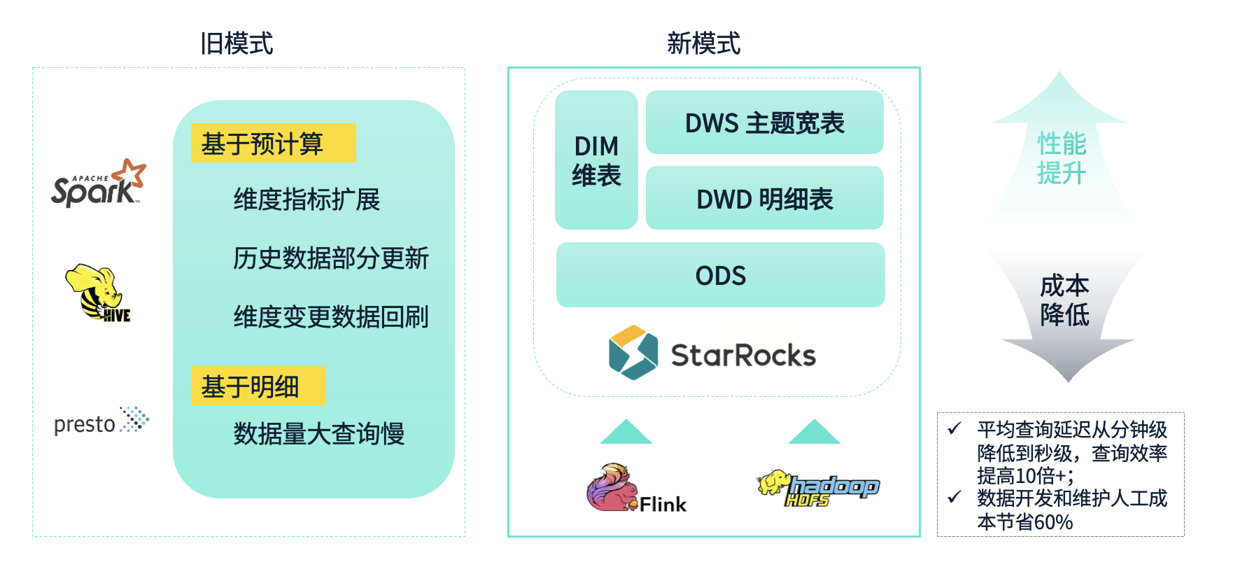 在性能方面,我们从最初的旧模式(分钟级延迟)转变为新模式(秒级查询),查询性能提升了数十倍。