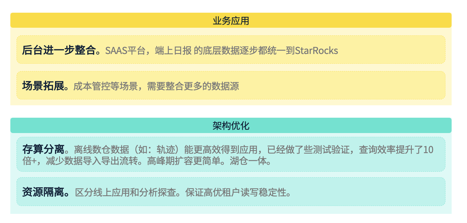 目前,我们通过引入 StarRocks,对底层数据进行了标准化与一致化,进入增效期,充分发挥数据的驱动价值,使其与业务产生更紧密的联动。由于数据架构的发展路径在业内较为相似,这里不再展开详细介绍。