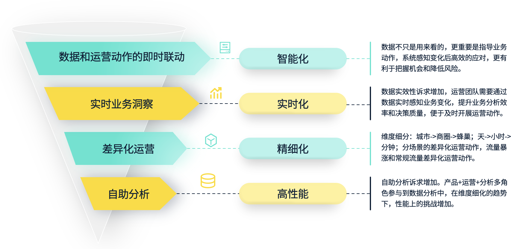 随着业务逐步拓展,开设的城市数量增加,需求来源和种类也变得更加多样,运力来源和总量也在不断扩大。我们进入了精细化运营阶段,这为数据建设和使用带来了许多挑战。首先,更多的角色将参与数据分析过程。其次,数据的视角和维度将更加丰富和细化,这对数据处理和查询提出了更高的要求。此外,数据的时效性要求也更为严格。业务需要更加实时的数据来感知变化并做出快速决策。这种实时联动不仅仅是通过报表展示数据,业务在看到数据后做出相应的动作,更是通过系统化的自动联动,实现智能化调控效果。