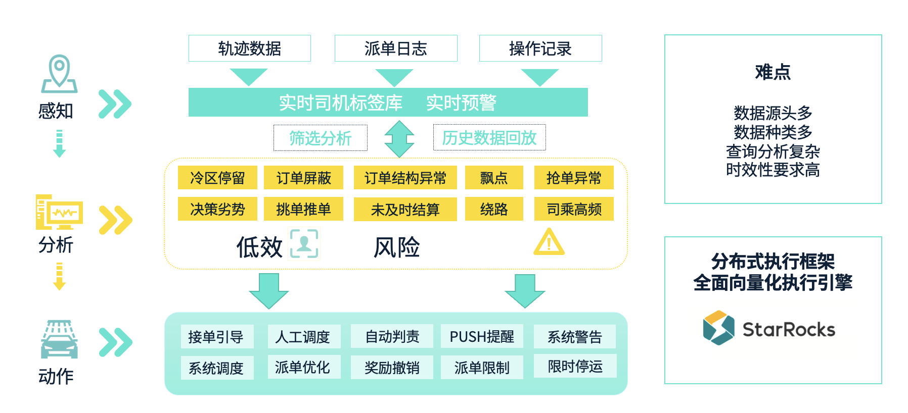 要全面感知和识别运力的各种问题,涉及到多个数据源和多种数据类型,这正是这个场景的主要难点。数据进来后,我们还需要进行复杂的计算,以统计出许多行为并进行标签化。基于这些标签,我们进一步在业务动作上进行联动。整体的查询分析复杂度高,且时效性要求强,这是该场景的另一个挑战。依托 StarRocks 的分布式执行框架、全面向量化的执行引擎等一系列处理能力,我们成功地支撑了这个场景的需求。