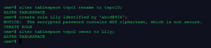 alter tablespace tspc1 rename to tspc10;create role Lily identified by 'abcd@456';alter tablespace tspc2 owner to Lily;\db