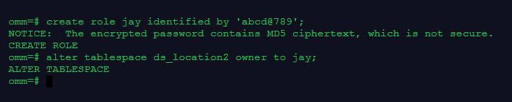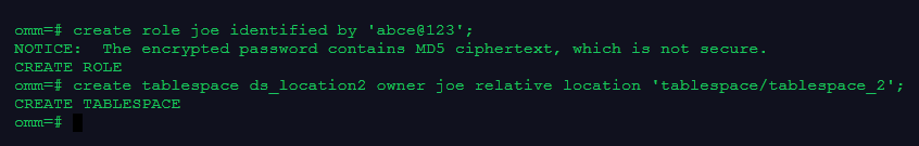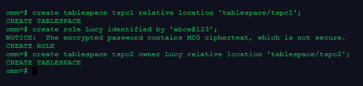 create tablespace tspc1 relative location 'tablespace/tspc1';create role Lucy identified by 'abce@123';create tablespace tspc2 owner Lucy relative location 'tablespace/tspc2';